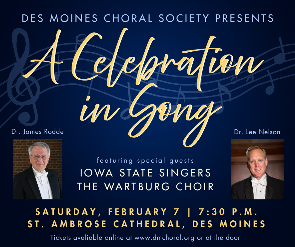 The Des Moines Choral Society presents A Celebration in Song, a collaborative concert featuring two renowned collegiate guest ensembles: the Iowa State Singers and the Wartburg Choir. The Des Moines Choral Society and each guest ensemble will offer its own set of selections, highlighting varied musical styles, languages and traditions that span sacred and secular works. The performance will feature modern pieces by American composers such as Marques Garrett, Shawn Kirchner and Elaine Hagenberg, as well as works by global composers such as Karlsons (Latvia), Miškinis (Lithuania), Gyöngyösi (Hungary), and more. The evening will conclude with a combined performance by all three choirs, and it will truly be a “Celebration in Song!”