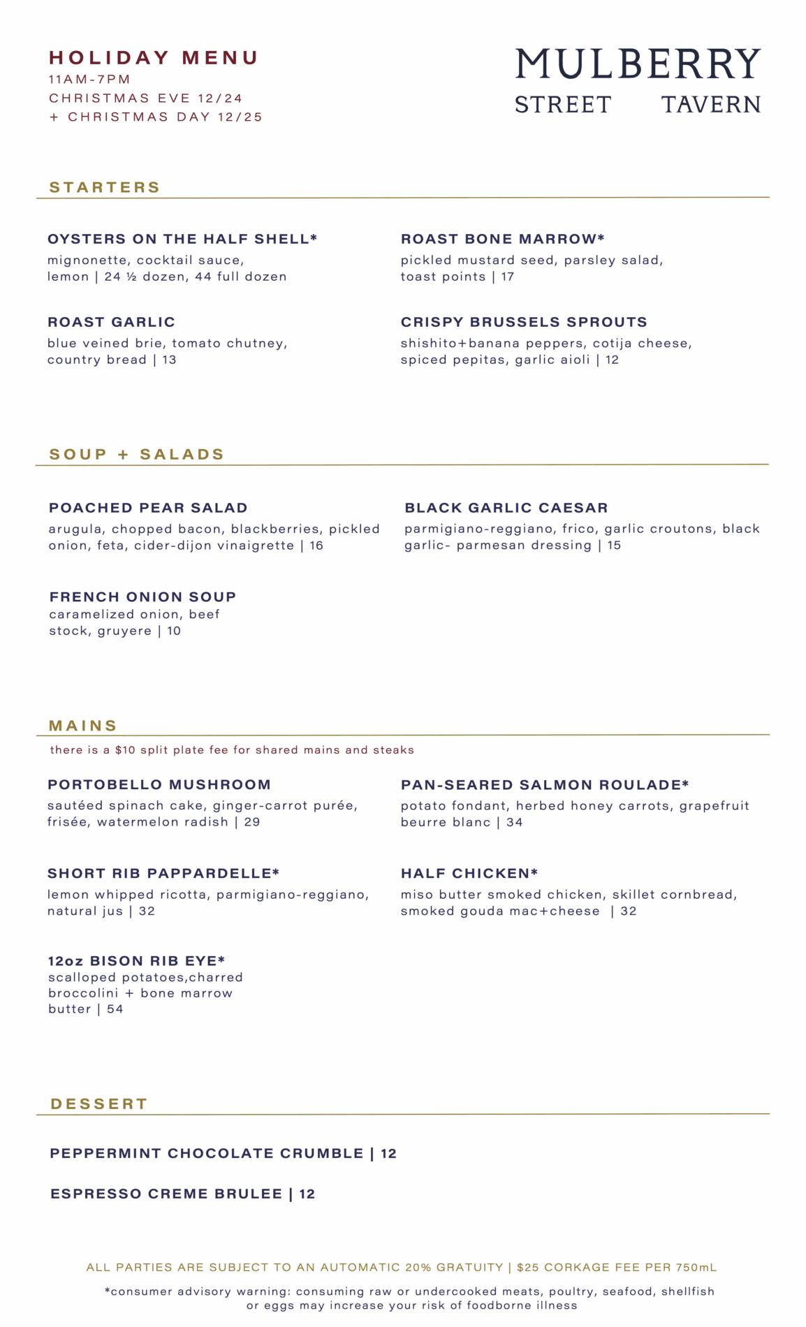 Our not so well-kept secret: Christmas Dinner is just better at Mulberry Street Tavern! All of the joy, none of the fuss. Indulge in our special holiday menu from 11 a.m. – 7 p.m. on Christmas Eve and Christmas Day. Reservations required — spots will fill up fast!