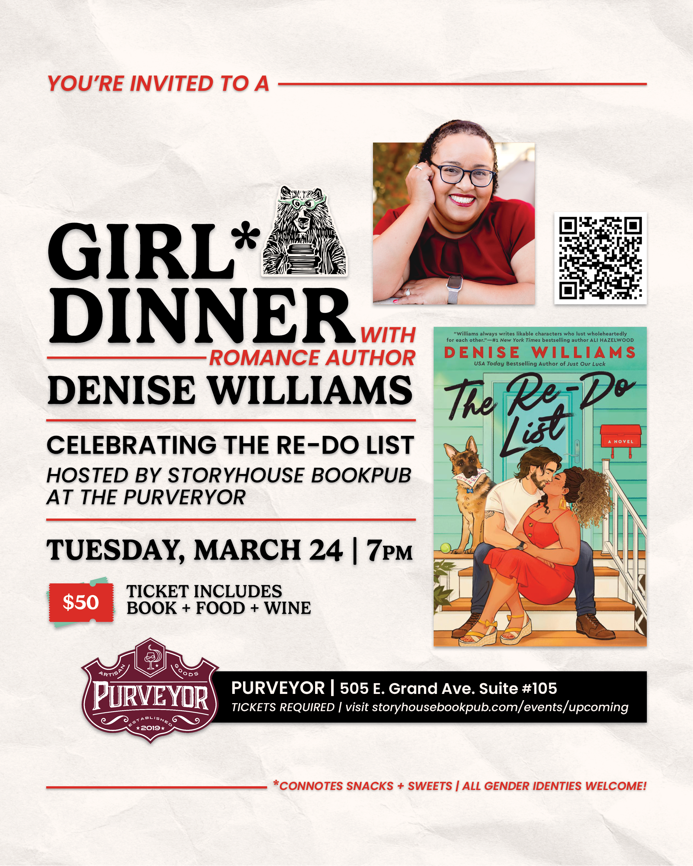 Romance readers! Join Storyhouse for a proper Girl Dinner* at The Purveyor celebrating Denise Williams’ latest, The Re-Do List. Seating is limited, so grab your ticket ASAP for Tuesday, March 24 at 7 p.m. — tickets include a copy of The Re-Do List + food + wine.