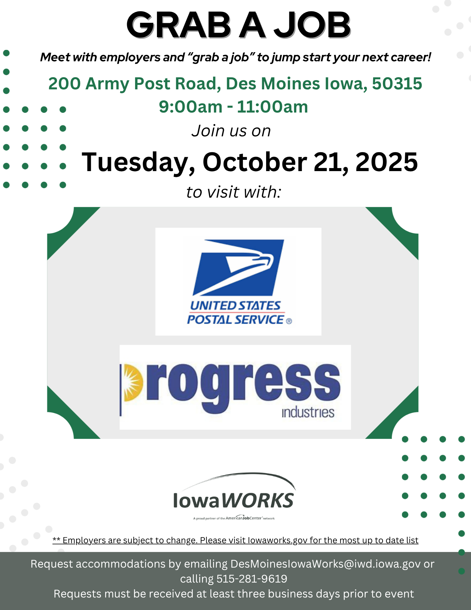 - Tuesday, Oct. 21, 2025 from 9 a.m. - 11 p.m.: IowaWORKS is hosting the Grab A Job Tuesday Hiring Event featuring: