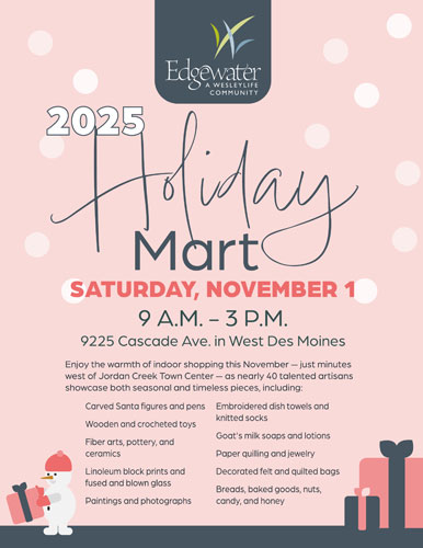 Last year, more than 800 guests attended WesleyLife Edgewater's Holiday Mart, purchasing gifts and specialty items for their family and friends ahead of the holiday season. And as gift buying gets underway this year, we've got a unique idea to share for purchasing meaningful gifts. Mark your calendar for Saturday, Nov. 1, 2025, where from 9 a.m. until 3 p.m. more than 36 Iowa artists and vendors will be showcasing personal creations at Edgewater at 9225 Cascade Ave. in West Des Moines. Tip: This event will be held in one building on the Edgewater campus, and there will be golf cart rides available on-site!