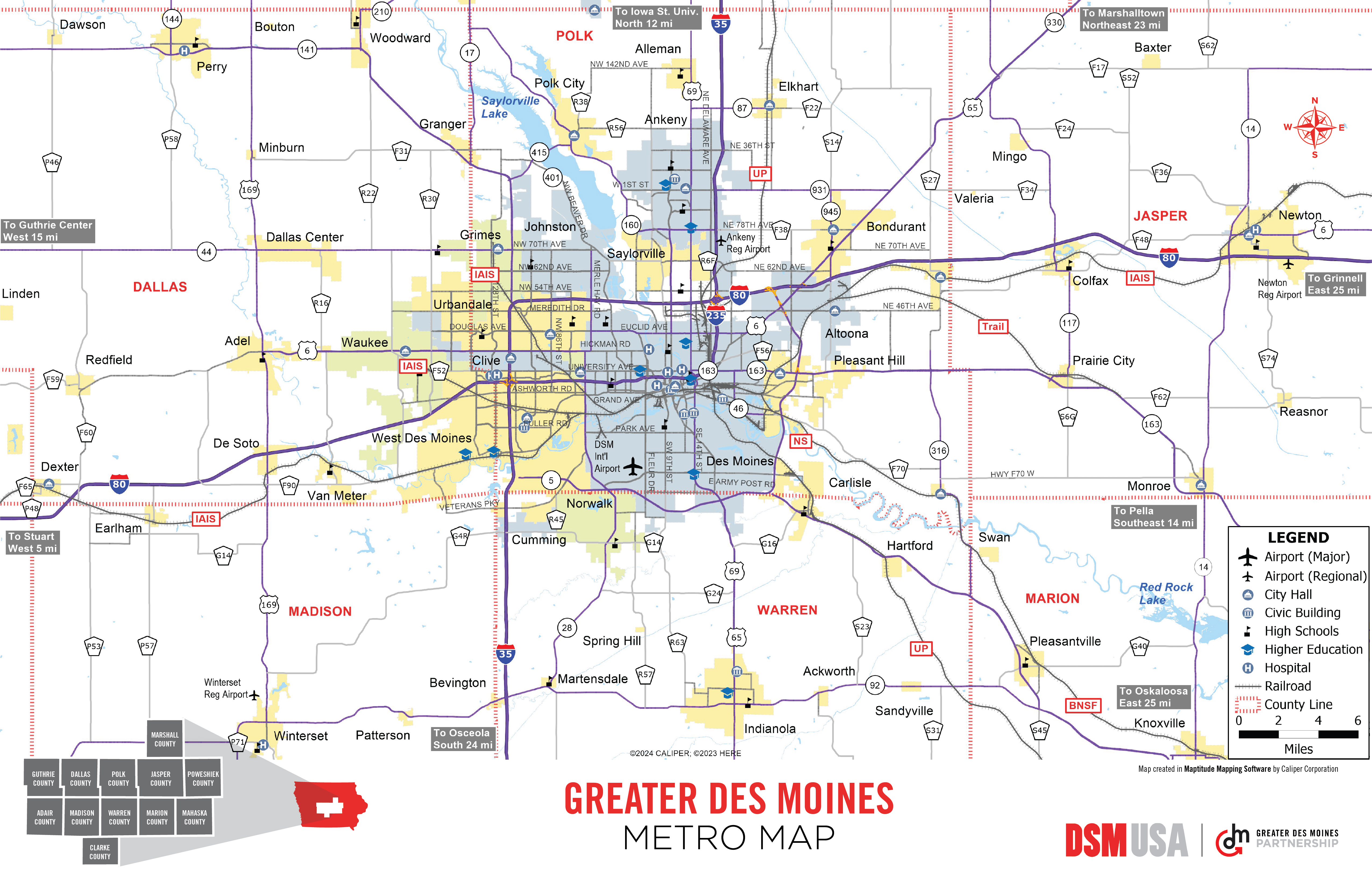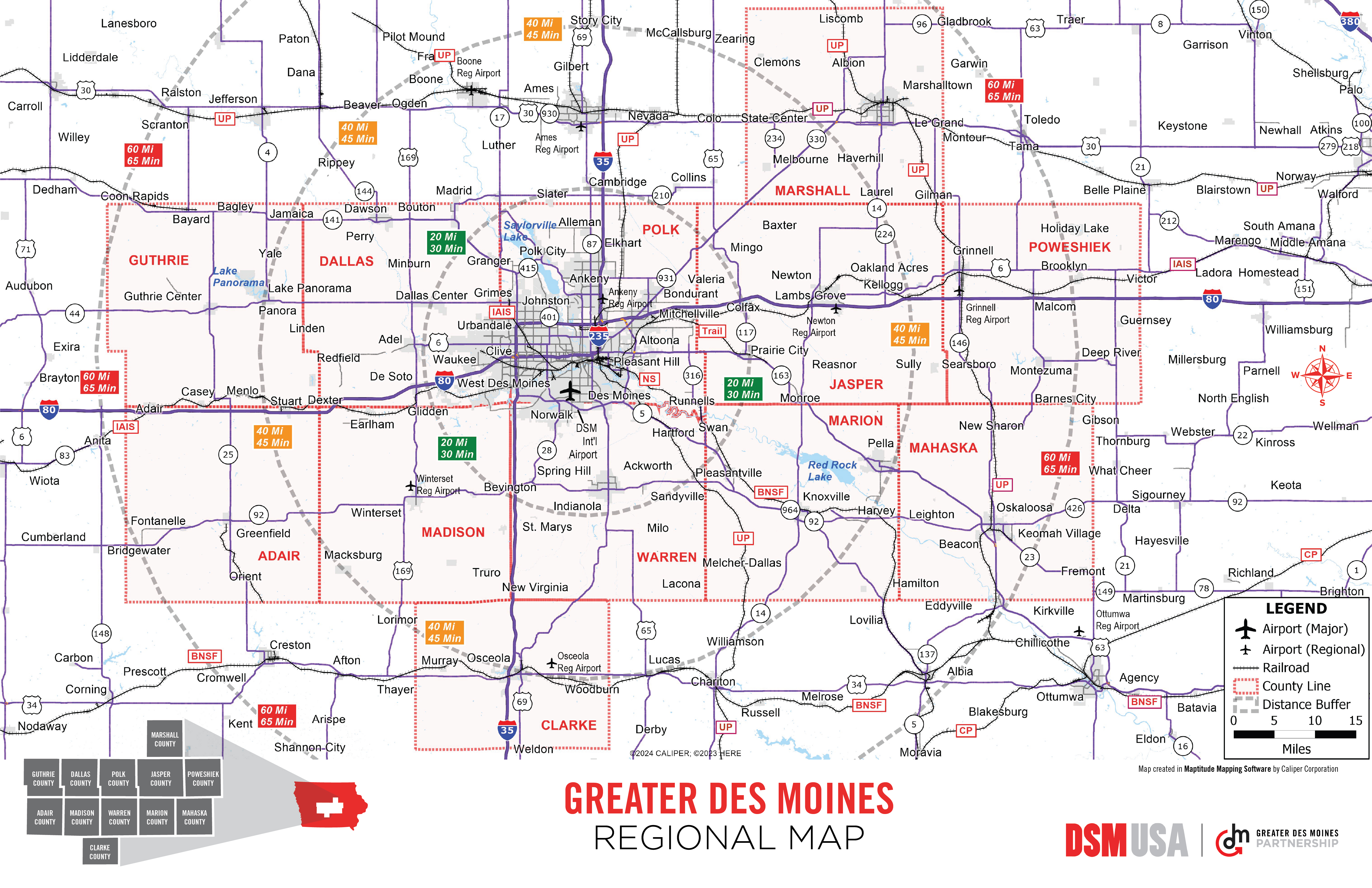 Greater Des Moines (DSM) is vibrant, growing and experiencing tremendous momentum. Metrics such as gross domestic product growth, population growth and employment growth show DSM as one of the strongest metros in the Midwest. The Partnership's service area covers 12 counties – Adair, Clarke, Dallas, Guthrie, Jasper, Madison, Mahaska, Marion, Marshall, Polk, Poweshiek and Warren. The region has a population of more than 885,000 people.