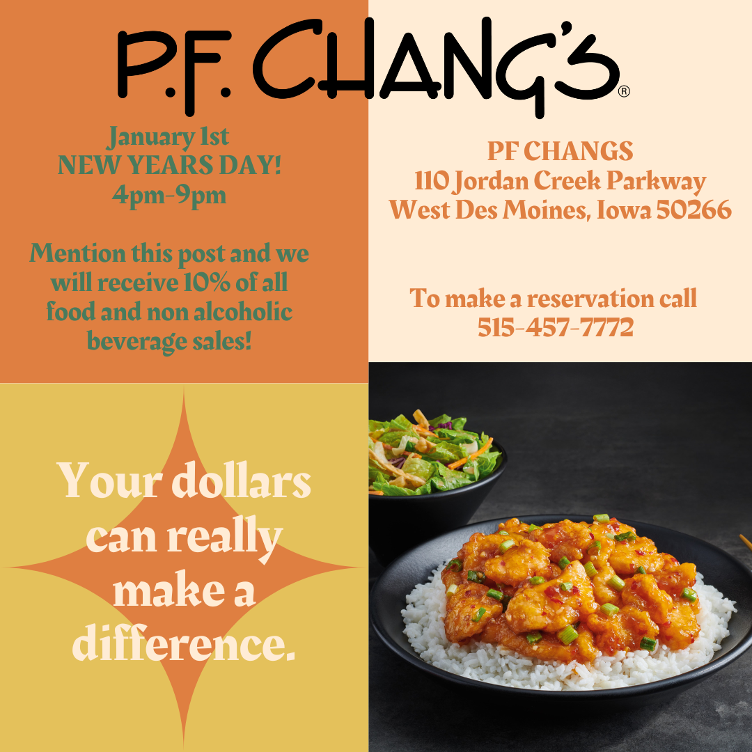 - During these challenging economic times, many nonprofits are feeling strained. If you plan to enjoy a meal out on New Year's Day, we invite you to visit P.F. Chang's (110 Jordan Creek Parkway in West Des Moines) and mention St. Vincent de Paul to contribute to our efforts. P.F. Chang will be donating 10% of all food and non-alcoholic beverage sales between 4-9 p.m.