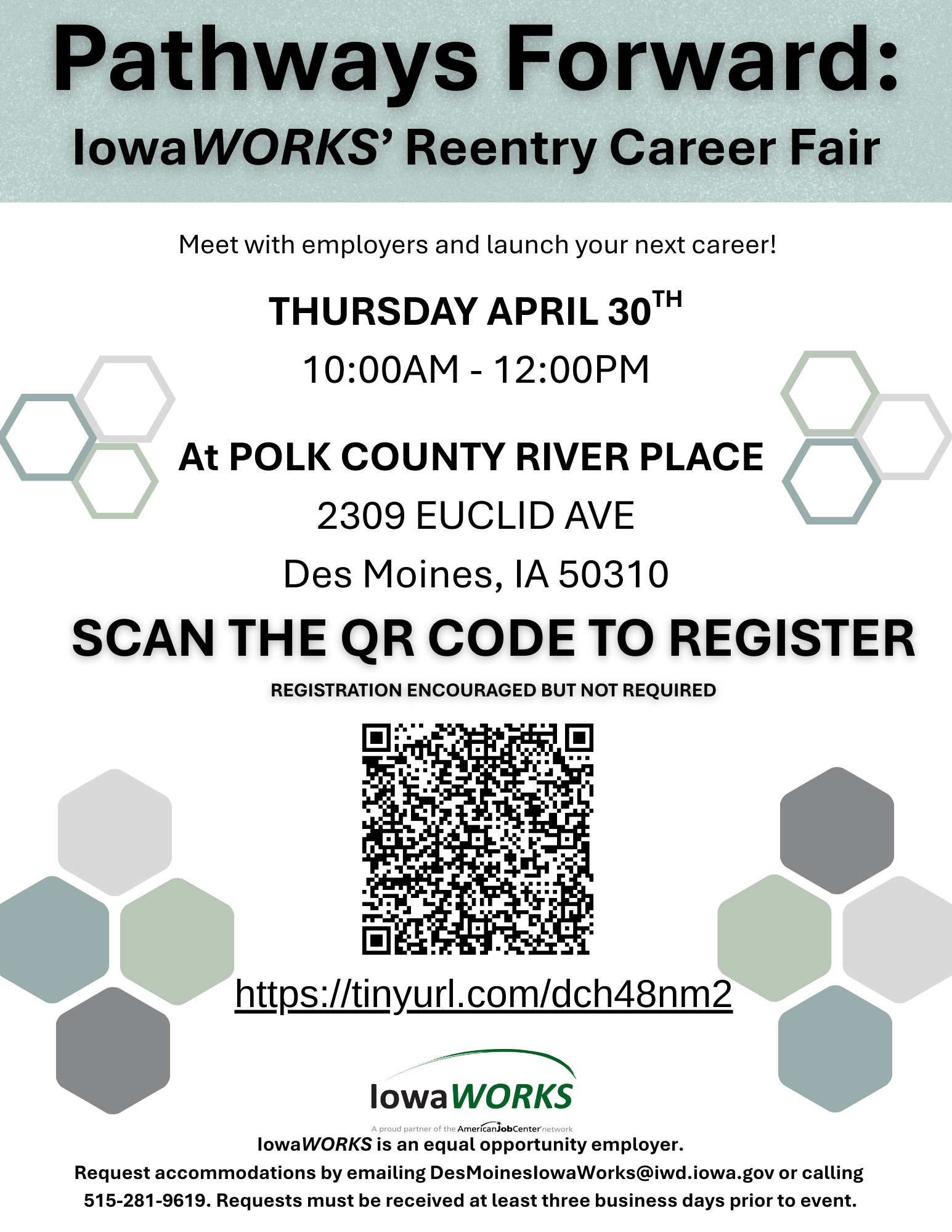 - Thursday, April 30, 2026, from 10 a.m. - Noon: Pathways Forward: IowaWORK'S Reentry Career Fair will be held at Polk County River Place at 2309 Euclid Ave. in Des Moines. See the flyer for more information.