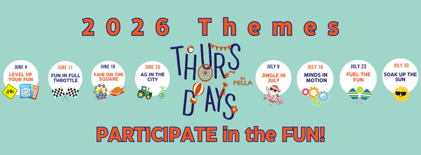 The word is out and Thursdays in Pella is a homerun for PACE Member businesses who want to get more exposure in the community. Greet customers and bring awareness to your business at festival-style summer events that offer live entertainment, fun contests and themed activities and food vendors weekly in Pella Central Park. Check out the 2026 lineup below: