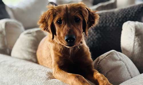 Our golden retriever, Ruby, is the sweetest, smartest, cutest, most well-behaved puppy in the world. If you ask me, she is nearly perfect. However, her adorability status momentarily decreased by a rather large margin when she converted our basement couch into a chew toy. The incident allegedly occurred on my husband’s watch, while he was busy (uh, distracted) with a project. It even took him a while to notice, because when he checked on Ruby, she appeared calm, innocent and sweet. Unfortunately, the very large hole with frayed edges on the left couch cushion was pretty difficult to miss, no matter what we did to hide it. Not good. Not good at all.